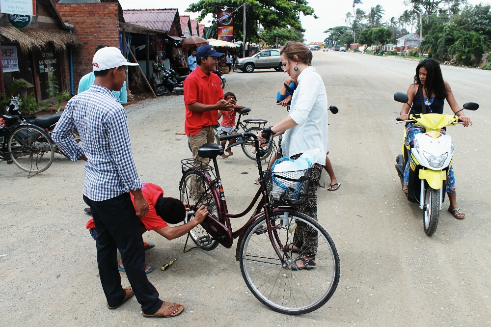 The next day we rented bicycles and headed towards the famous Crab Market. We bought some stodge and moved on. Here’s a little story to show you how nice Cambodians are. Katie’s bicycle chain had fallen off, the only problem was the chain protected by some casing and we needed a screw driver. Enter 2 guys who tried to help with make-shift tools: tiles, meat cleavers, random wires. Finally one of their sisters or girlfriends shows up on her moped with a screwdriver. They fixed her bike and went on their way.