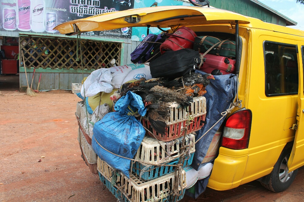 So, in total, we had 27 people, approx 12 chickens, numerous bags of rice and everyone’s luggage in an 11 seater mini bus. Up hills were a struggle but the poor luggage guy on the back must have been holding on for dear life because the driver was not holding back on the downhills and corners. 6 miserable hours later we arrived in Koh Kong, both walking like John Wayne to our guesthouse.