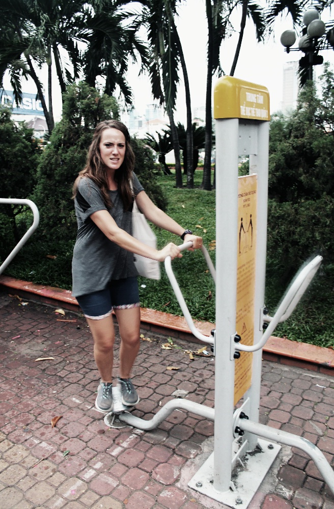 There are several churches throughout HCMC. There’s a pink one and one that resembles Notre Dame. After seeing the real Notre Dame in Paris, I wouldn’t really say the one in HCMC is as impressive, but a walk by is well worth it. After that, we meandered through the city streets. We came across a little fitness area in a city centre park. I love pretty much anything that’s free so we had a quick go.